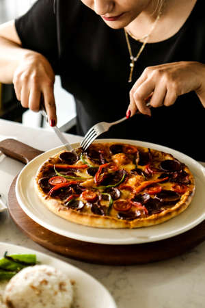 woman hands Slicing fresh pizza with beans, cheese, ham, eggs, pepperoni and vegetables. Cutting pizza