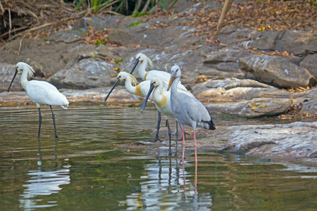 black-faced spoonbill and seagull foraging in wetland