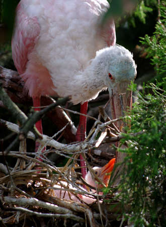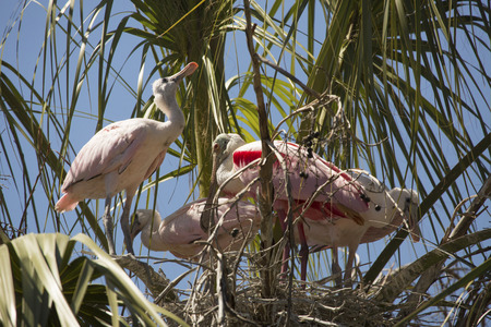 Two Roseate Spoonbill with chicks.