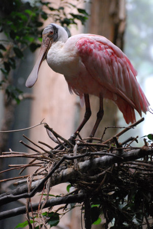 Beautiful Roseate Spoonbill bird perched on a nest in a tree.