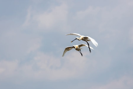 A flock of Eurasian Spoonbill or common spoonbill (Platalea leucorodia) in flight. Gelderland in the Netherlands.