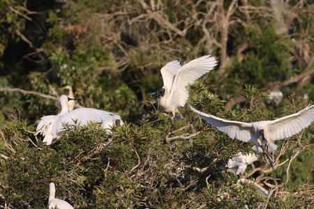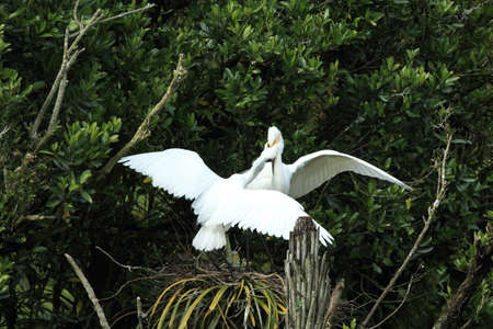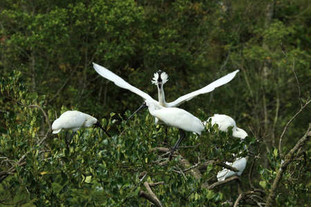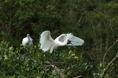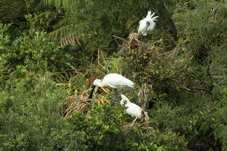 Royal Spoonbill nesting at the mouth of Waitangiroto River in the rain forest West Coast, New Zealand