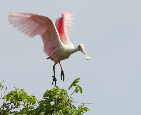 Roseate Spoonbill, Platalea ajaja, landing in tree