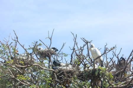 Birds in nests on the tree at sunny day and blue sky