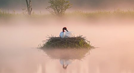 Two white birds in a nest on a foggy morning.