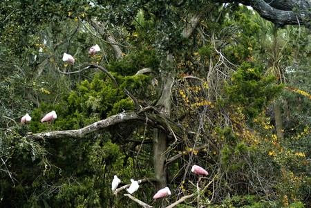 The Roseate Spoonbills on the tree in St. Augustine, FL.