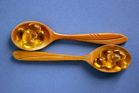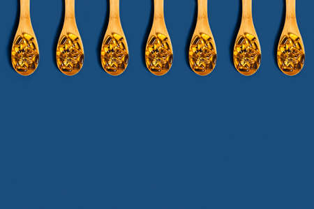 Medical classic blue background. Fish oil capsules in a wooden spoons. Flat lay, top view.