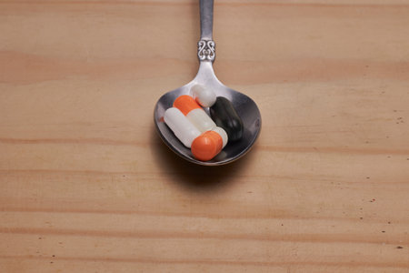 A close-up of a spoon filled with assorted capsules and tablets, showing everyday medicine imagery suitable for health, wellness, medical, and pharmaceutical contexts. Ideal for healthcare and dosage discussions.
