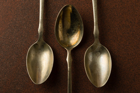 Set of different spoons. Silver cutlery on a black background. Spoon on the table