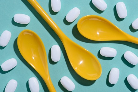 top view of yellow plastic spoons surrounded with pills on blue tabletop
