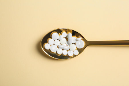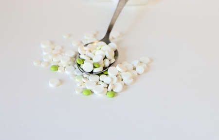 Spoon with pills on an isolated white background, concept of breakfast medicines.