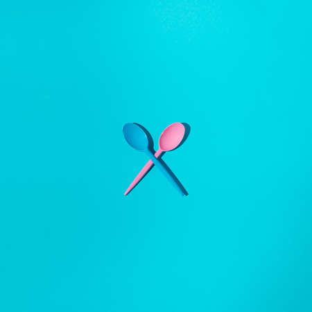 Pink and blue plastic spoons crossed on blue background. Minimal concept.