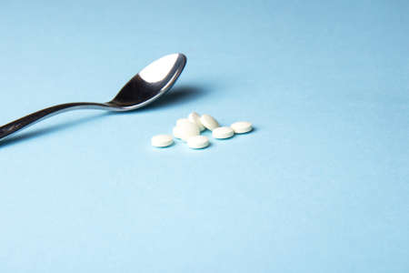Dietary supplements. Vitamin tablets in an iron spoon on a blue background. Complementary and medical products