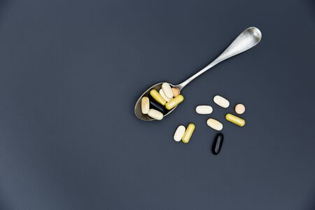Tablets, capsules, pills in spoon on bright background. The concept of medicine and health. Studio Photo