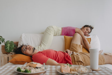 A loving couple shares a close, intimate moment, lying together on a vibrant yellow sofa