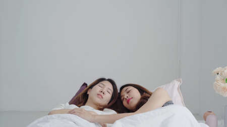 Beautiful young asian women LGBT lesbian happy couple sitting on bed hug and using phone taking selfie together bedroom at home. LGBT lesbian couple together indoors concept. Spending nice time home.