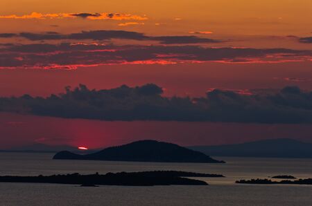 Sunset at sea, with small greek islands in background, Sithonia, Greece