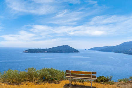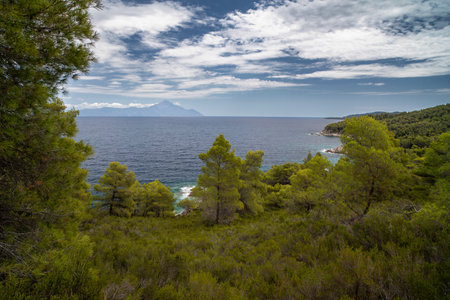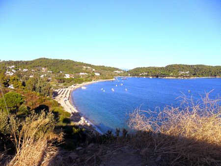 Troulos beach, Skiathos island, Greece. Beautiful vivid panorama view of blue aegean sea coast from wild cliff. Summer holiday vacation tour to greek islands.