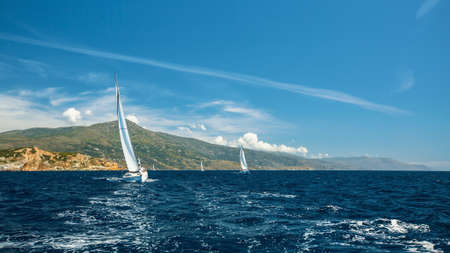 Sailing in the wind through the waves at Sea. Luxury yachts at Regatta.