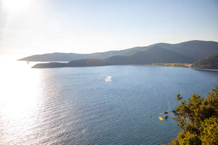 Mountains and azure Aegean sea on a bright sunny day. Travel to Turkey. Beautiful seascape. Panorama.