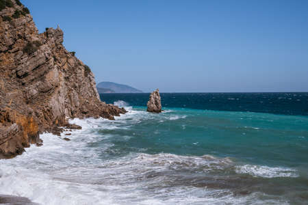 Rough sea with waves crashing against cliffs in Crimea, black sea, view from Yalta, swallow's nest