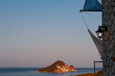 Greek coastline at early morning sun rising, Greece Peloponnese Mani. Beautiful landscape natural scenery.
