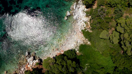 Mediterranean Greek landscape beach drone shot. Aerial top view of Sithonia Chalkidiki peninsula above rocky coastal with green plantation and crystal-clear waters.