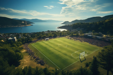 Top view of a soccer field near the sea and between mountains with players on the field.