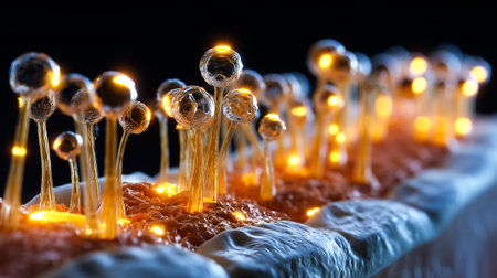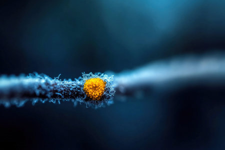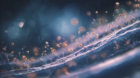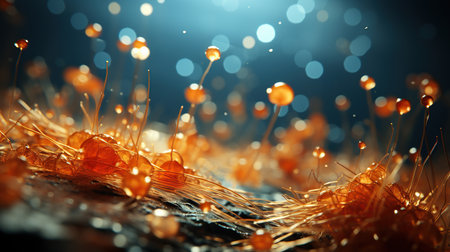 This stunning close-up image reveals the intricate beauty of fungi spores and mycelium in a microscopic setting, showcasing vibrant golden details.