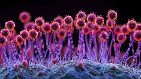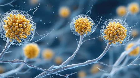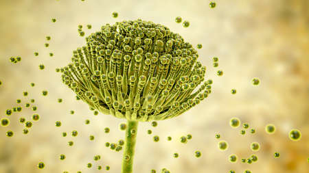 Aspergillus fumigatus under the microscope. A species of higher mold fungi of the genus Aspergillus, a saprophyte and pathogen for humans. 3d visualization.