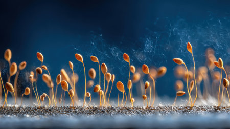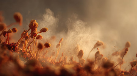 A stunning close-up view of fungi spores emerging from the forest floor, enveloped in a soft mist. This image captures the delicate beauty of nature's growth cycle.