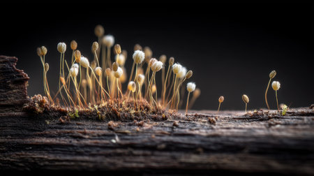 A stunning close-up of delicate moss and fungal growth on a piece of weathered wood, showcasing nature