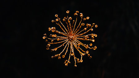 A close-up view of a golden decorative flower, featuring numerous small, shimmering beads at the end of delicate wire-like stems, creating a radiant and intricate design against a deep, dark backgrou.
