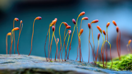 This macro photograph showcases slender plant stems, each topped with a vibrant orange seed pod, set against a blurred blue backdrop. The image highlights the textures and delicate structures of nature, with a focus on color and form. Suitable for various applications, including botanical illustrations and educational materials, this image emphasizes natural beauty.