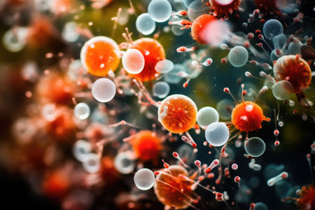 Candida albicans and bacteria colonies under the microscope. Created with Generative AI