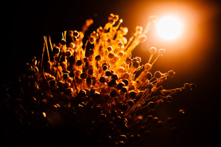 a close-up portrait photograph showcasing the intricate details of unknown escherichia coli biological virus alien flowers. the image captures the brittle yet beautiful essence of these flowers, with dry and elegant petals. the rich and vivid contrast, along with the depth of field and black tones, creates a crisp and realistic depiction. shot on a 100mm lens with an aperture of f/2.0, the natural lighting