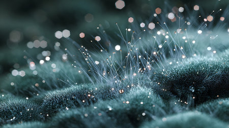 This enchanting close-up image captures vibrant moss adorned with dew drops, radiating a magical glow in a serene natural setting.
