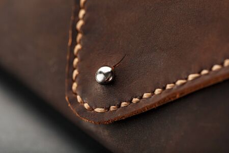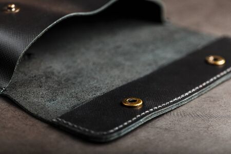 Black wallet made of genuine leather on a dark background. Handmade leather items. Rivets and seam close up