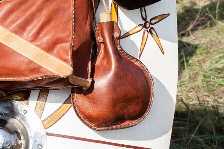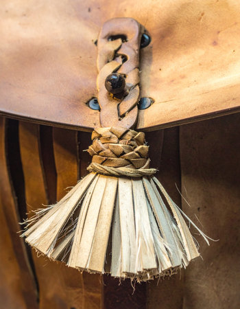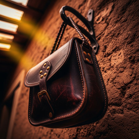 Sunlight warms the surface of a handcrafted leather bag, highlighting the meticulous detail of its hand-stitched strap and sturdy metal rivet.