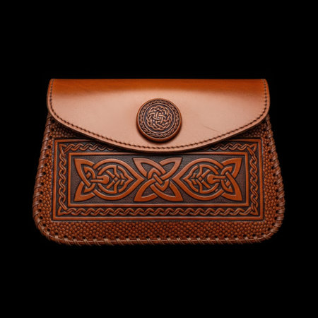 A vintage brown leather pouch featuring intricate Celtic knotwork engraving and a decorative circular closure, presented against a black background.