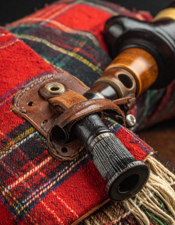 A close-up view captures the rich textures of traditional Scottish bagpipes resting on a vibrant red tartan plaid.