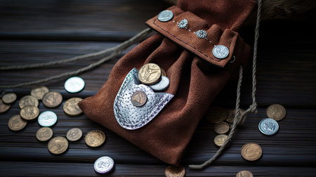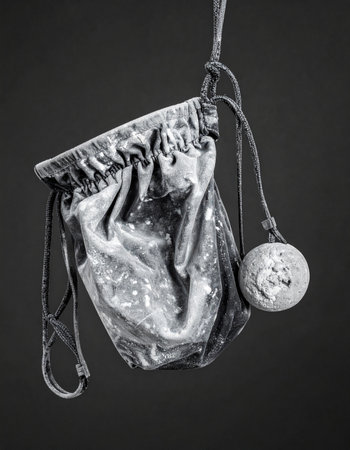 A single, well-worn medieval pouch hangs in the darkness, its silvered surface hinting at countless journeys. The tightly drawn string guards its secrets, suggesting a hidden treasure, ancient coins, or a magical artifact from a forgotten time. A perfect concept for fantasy, history, and adventure.