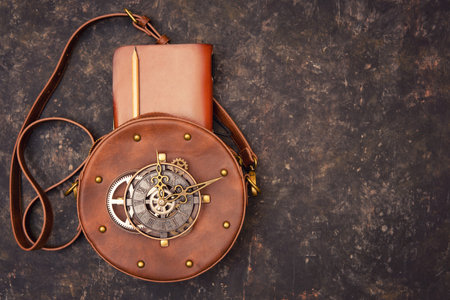 Leather journal and a pencil sticking out of a circle steampunk leather bag with a clockwork on the outside on a grungy background.