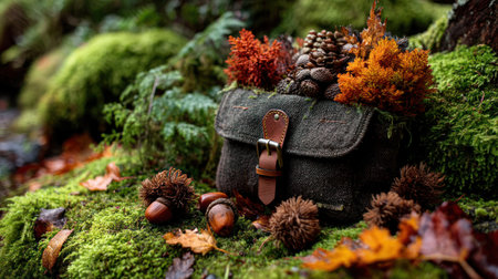 A rustic bag filled with pine cones and moss sits on vibrant green moss surrounded by acorns and leaves creating cozy cottagecore vibe