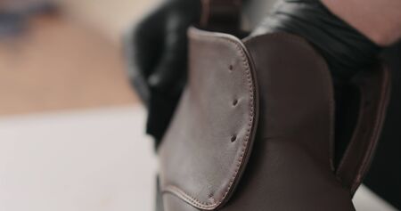 man hands in black gloves applying protective cream to brown leather chukka boots, wide photo