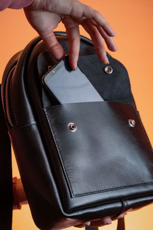 A woman's hand pulls the phone out of the pocket of a leather backpack on an orange background. High quality photo