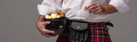 cropped view of Scottish man in red kilt holding potty with gold coins on grey background, panoramic crop