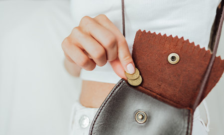 A fashionable hand of a woman holding a luxurious wallet with intricate details, set against a neutral backdrop.