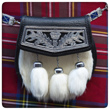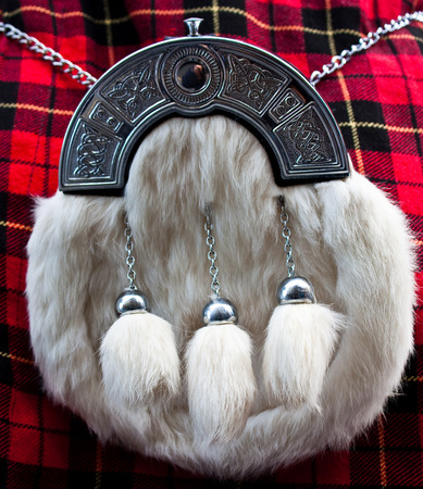 Closeup of traditional Sporran on blue kilt, it is a purse which is a part of male Scottish Highland dress.