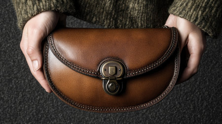 A close-up view of an elegant brown leather handbag held by a person, showcasing its craftsmanship and texture in a warm natural light setting.
